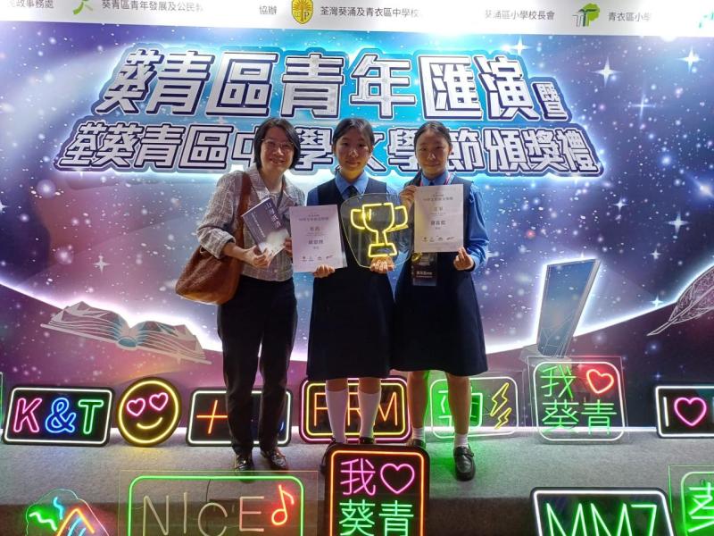 由葵青區青年發展及公民教育委員會及荃灣葵涌及青衣區中學校長會主辦的「第一屆荃葵青區中學文學節」圓滿結束。本校同學在「徵文比賽」表現優異,中三丙班蕭蕊藍同學獲得「初中散文組亞軍」,中三丙班胡恩熙同學獲得「初中散文組推薦獎」,成績令人鼓舞。希望同學繼續保持對創作的熱忱,享受寫作的旅程!